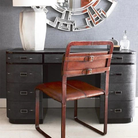This very unique and stylish desk chair with beautiful buckle detailing on the back will make a bold statement in your office or study.