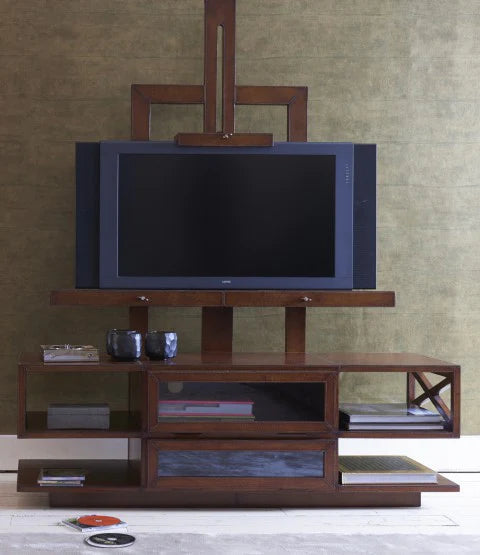 Handmade, this lovely easel-shaped stand upholstered in leather creates an attractive and unique way to display your television.